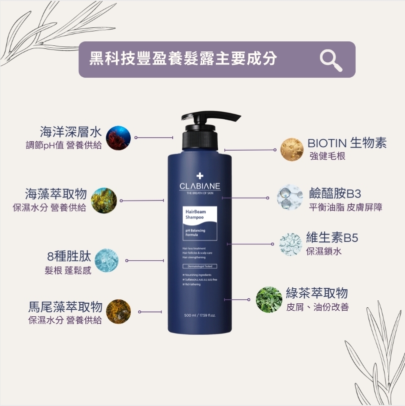 歐美專利成份、生物素、Vitamin B5、8種胜肽、水楊酸、馬尾藻萃取與薄荷醇等溫和配方。天然椰子油起泡,平衡頭皮油脂不乾澀,舒緩頭皮不適狀況,幫助髮根強健、增加毛髮蓬鬆感。
